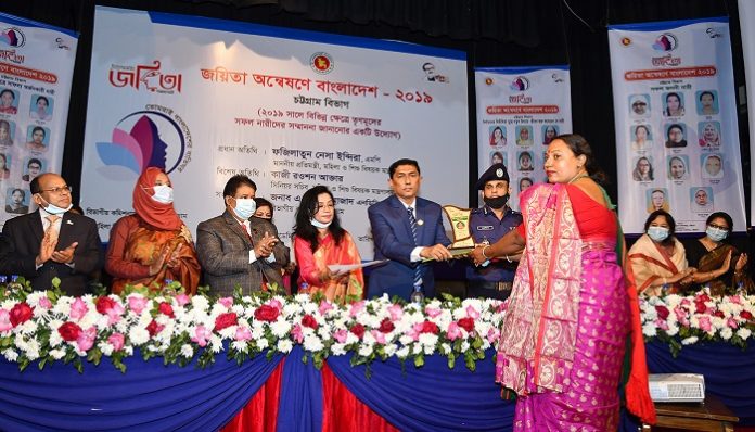 বিভিন্নক্ষেত্রে সফলতার জন্য ৫৪ জন নারীকে জয়িতা হিসেবে সম্মাননা জানিয়েছে চট্টগ্রাম বিভাগীয় প্রশাসন। তাদের দেয়া হয়েছে সনদ ক্রেষ্ট ও সম্মানী । মহিলা ও শিশু বিষয়ক প্রতিমন্ত্রী ফজিলাতুন নেসা ইন্দিরা এমপি বুধবার সকাল ১১ টায় ঢাকা থেকে ভিডিও কনফারেন্সের মাধ্যমে চট্টগ্রাম জেলা শিল্পকলা একাডেমিতে চট্টগ্রাম জেলা জয়িতা সংর্ধ্বনা অনুষ্ঠানে প্রধান অতিথির বক্তব্য রাখেন।