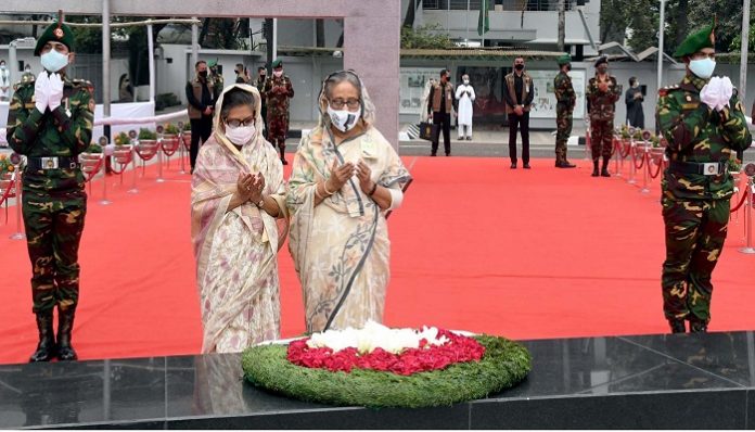 বঙ্গবন্ধুর প্রতিকৃতিতে শ্রদ্ধা নিবেদন শেষে মুনজাত করছেন প্রধানমন্ত্রী শেখ হাসিনা ও ছোট বোন শেখ রেহেনা